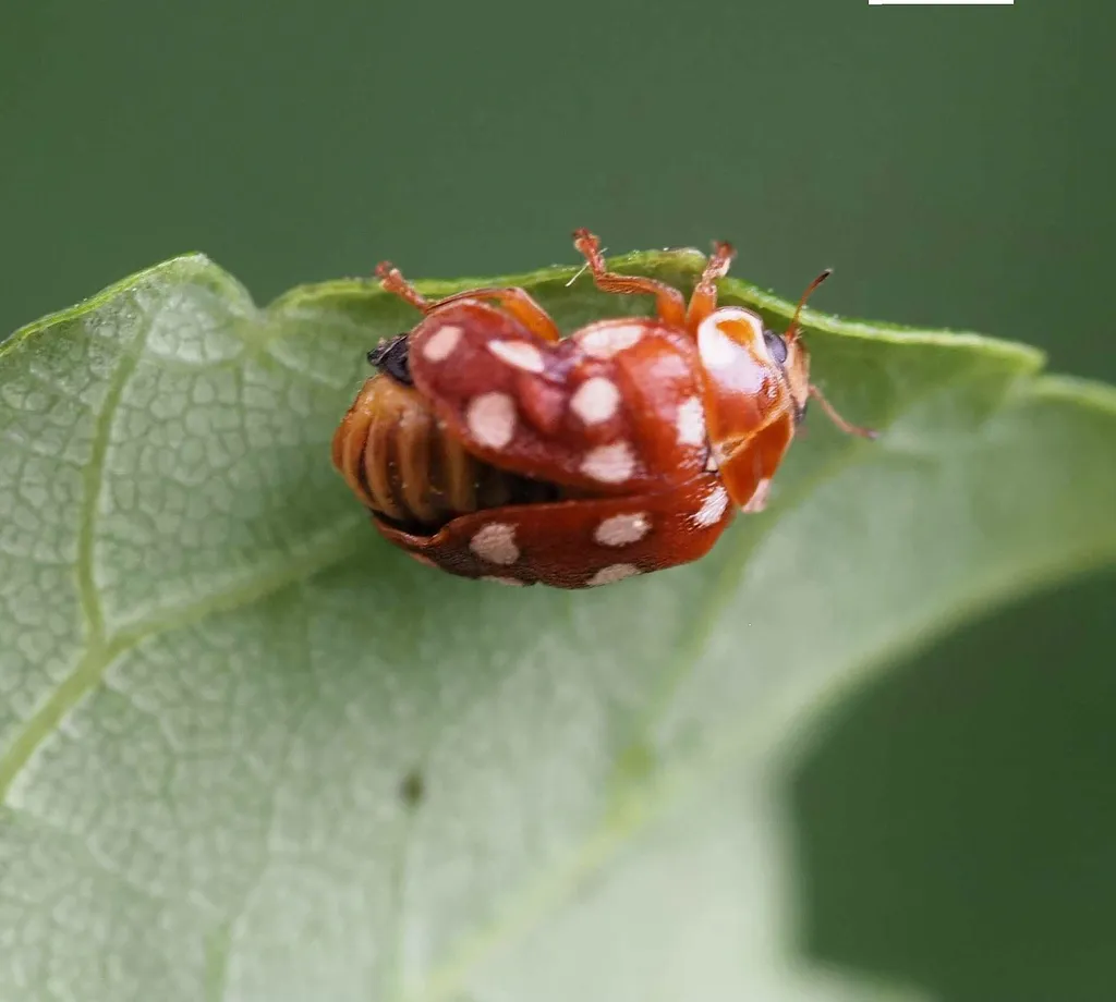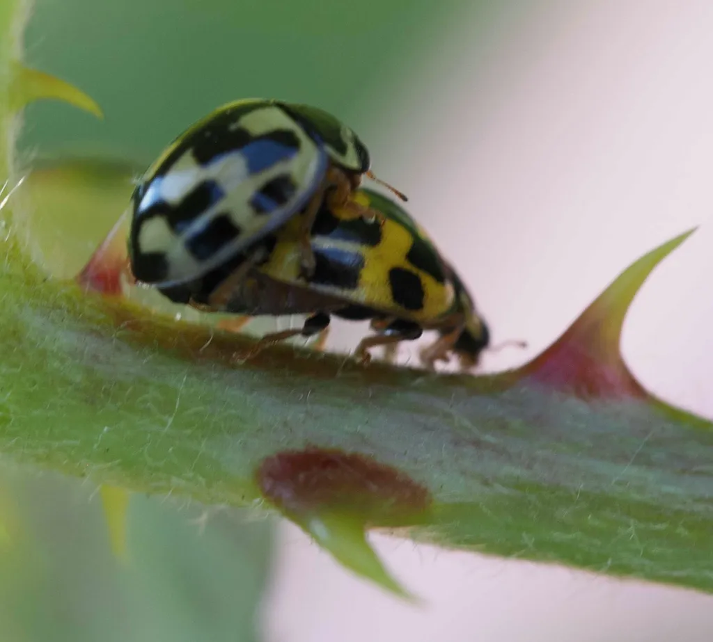 Die beiden Marienkäfer oben im ersten Bild, die gerade für Nachwuchs sorgen, könnten zu den Schachbrettmarienkäfer (ebenfalls 14-Punkt-Marienkäfer) gehören.