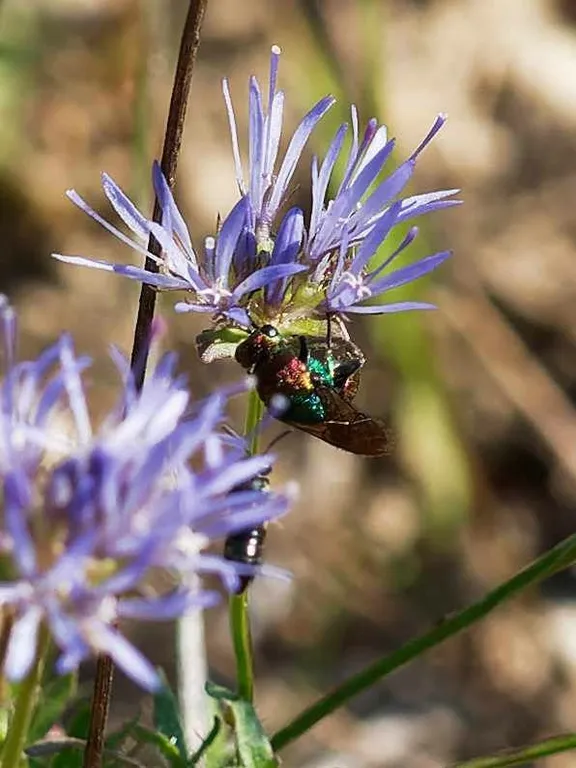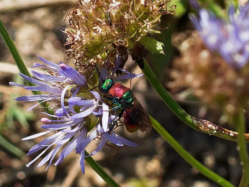 Die Blutbiene sieht in Größe und Färbung nach Sphecodes albilabris aus. Die Goldwespe ist wohl eine Hedychrum, ob rutilans, nobile oder noch eine andere Art, weiß ich nicht. Das schwarze Bienchen mit der gelben Gesichtszeichnung gehört zur Gattung Hylaeus, darauf folgt eine Filzbiene der Gattung Epeolus. Ob das letztgezeigte nicht eher eine Villa (hottentotta?) ist...