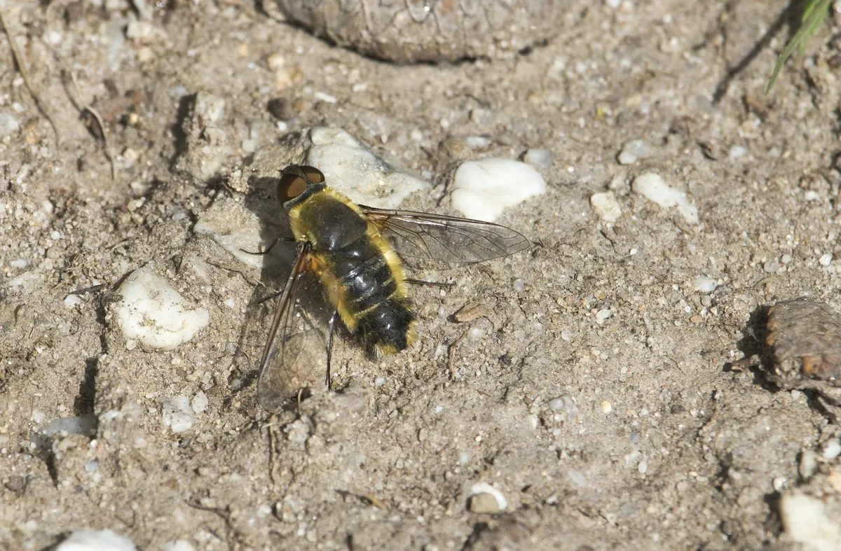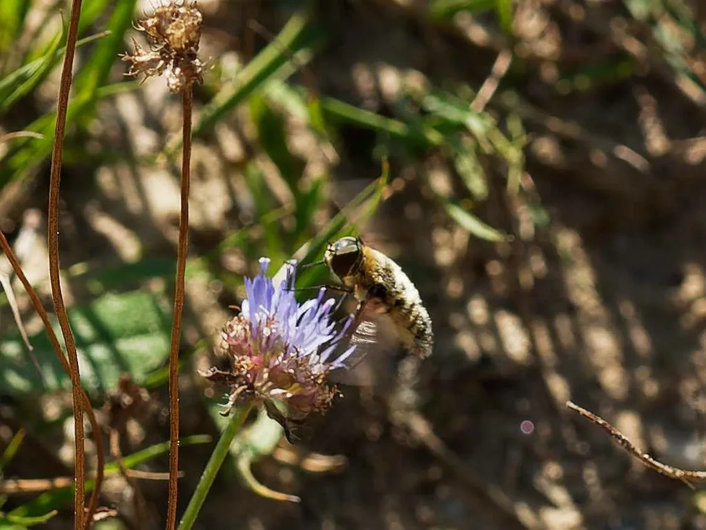 Hier hatte ich zunächst an einen Wollschweber gedacht, denke aber, dass es der Große Wollschweber auf keinen Fall ist und für den Kleinen Wollschweber hat er mir zu wenig Haare... Wahrscheinlich gehört er schon zu den Schwebern (Bombyliidae), aber da muss ich noch weiter suchen... Bisher fehlte die Zeit.