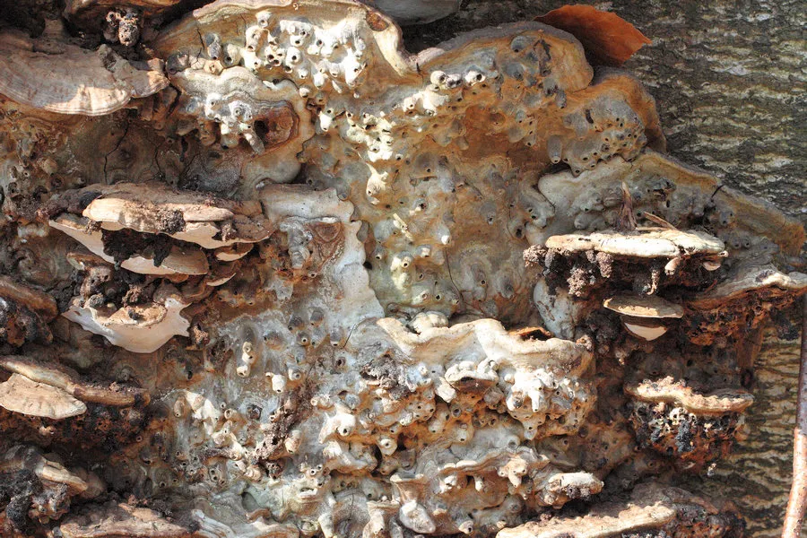 Den Flachen Lackporling konnten dir schon genügend Forumer bestimmen, ich biete jetzt noch Agathomyia wankowiczii aus meinem Archiv an. Da fühlt man sich fast an eine Tropfsteinhöhle erinnert.