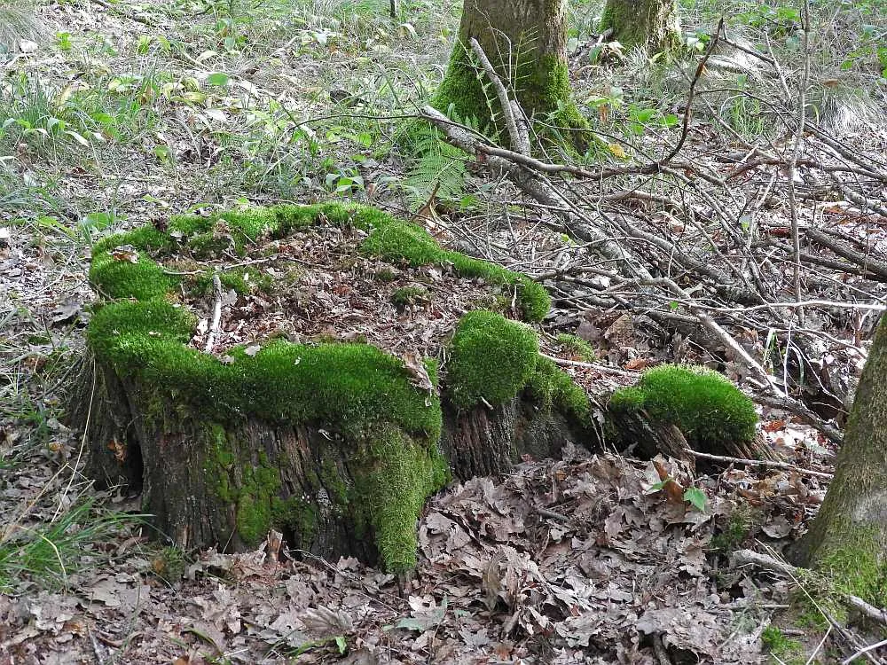 mein Augenmerk auf einen bemoosten Baumstubben gerichtet.