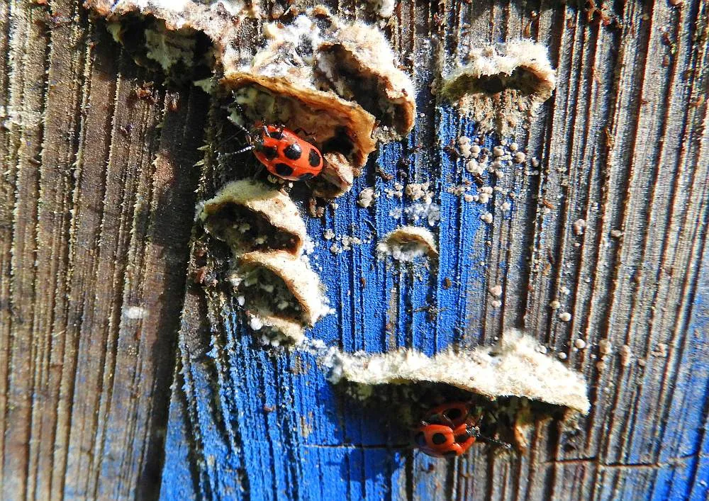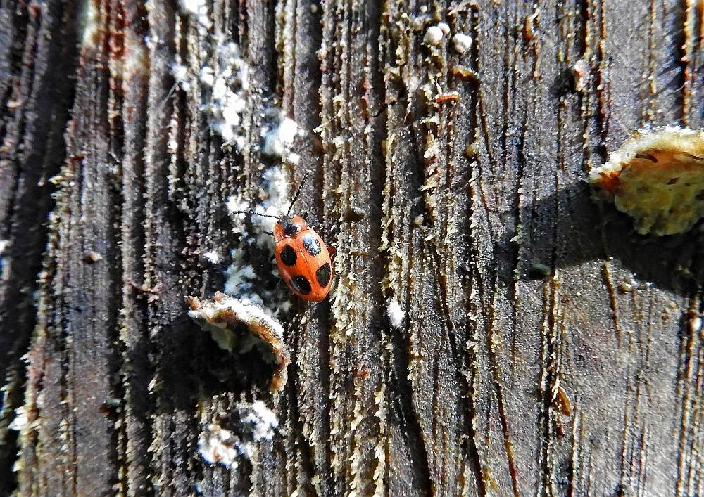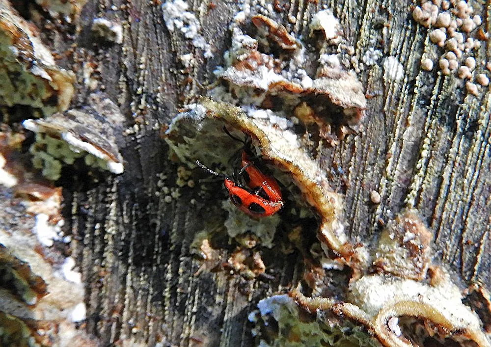 Und noch nicht genug, an der Schnittfläche des gleichen Baumes die Scharlachroten Stäublingskäfer.