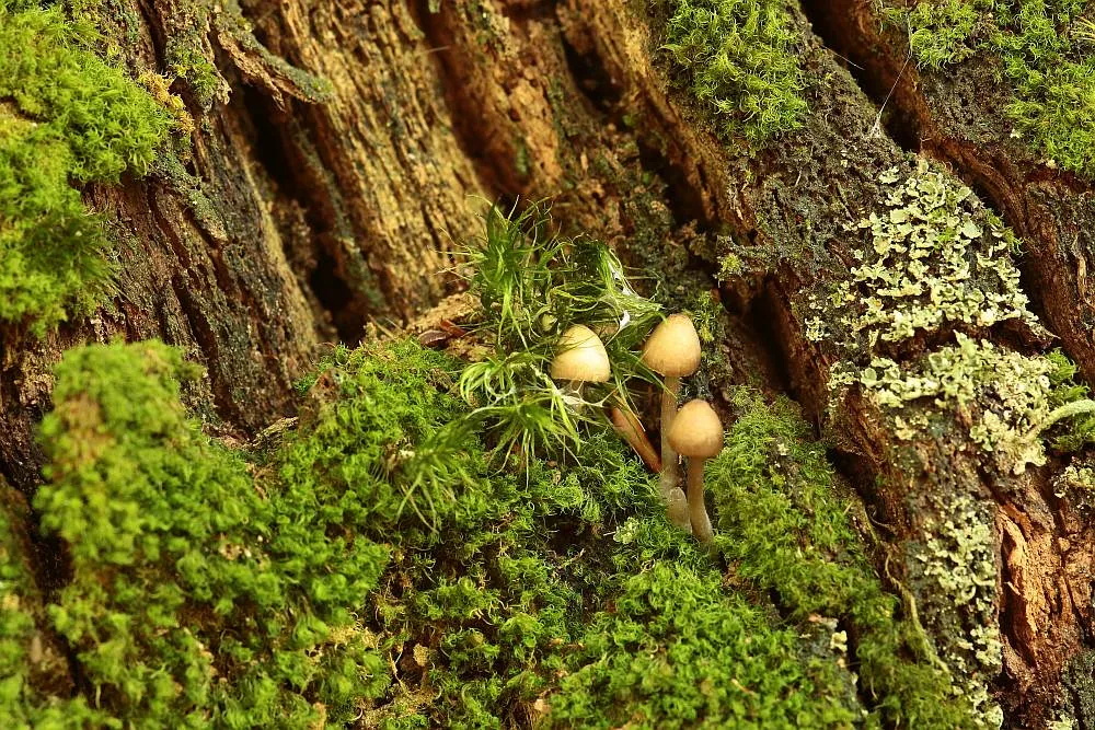 Kleine Minipilze wuchsen aus dem Moos