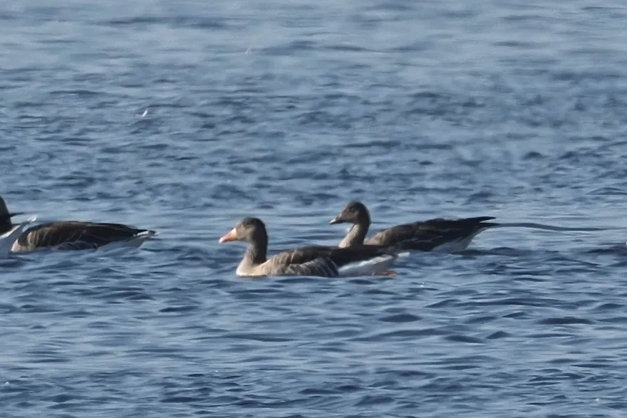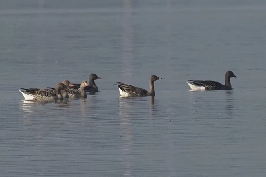 Hier sind wir uns nicht ganz sicher, ob wir richtig liegen, denn Merlin zeigte mitunter auch eine Kurzschnabelgans an, aber der farbige Streifen auf dem Schnabel lässt mich doch recht arg zur Tundrasaatgans tendieren.