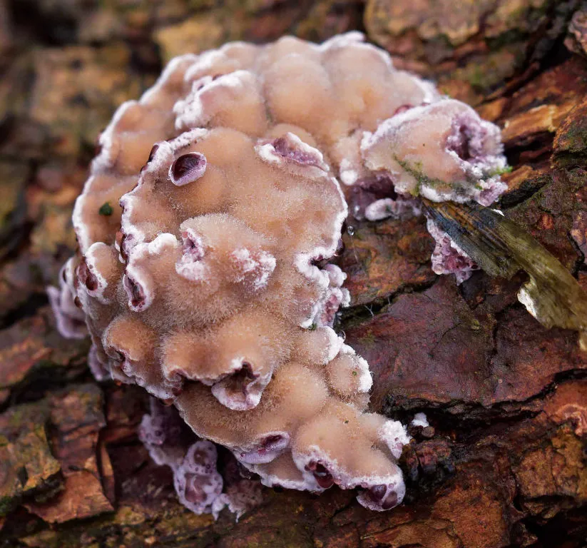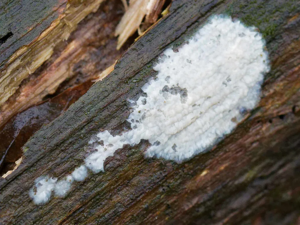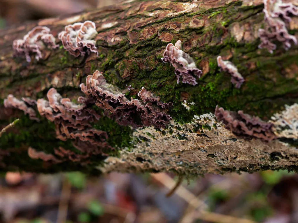 Ich fand den Violetter Knorpelschichtpilz (Chondrostereum purpureum) wieder. Allerdings war er nicht mehr so leuchtend wie beim ersten Mal. Mir war aber nicht klar, ob das an der Alterung lag oder ob sie sich erst entwickelten.
