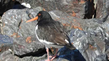 ich bin jetzt ehrlich gesagt ziemlich geplättet. Dass die beiden Austernfischer schnell zu finden sind, war eigentlich klar. Auf die Idee für das Rätsel bin ich direkt vor Ort gekommen, als sich der Vogel auf die scharzen Buhnensteine gesetzt hat. Der war fürs Auge sozusagen sofort unsichtbar, und ich musste ihn mit der Kamera richtig suchen. Also erstmal mein Dank an alle, die das Späßle mitgemacht haben. Und dafür gibt es erstmal den Bildausschnitt vom Austernfischer.