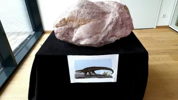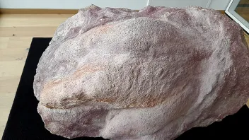 ... hat ein Sammlerkollege in einem Steinbruch bei Bayreuth in Oberfranken gefunden. Mehrere Leute waren nötig, um das fast 1 Meter große Fossil heil zu bergen.Auf einer Mineralienbörse war es dann erstmals öffentlich ausgestellt. Allerdings erfolgte bisher noch keine wissenschaftliche Bearbeitung und Beschreibung.