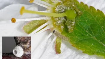 Nierenfleck-Zipfelfalter (Thecla betulae), hier das Eiräupchen an einer halbierten Schlehenblüte.