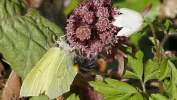 Wiesenhummel (Bombus pratorum), sie scheuchte den Zitronenfalter von der Pestwurzblüte.